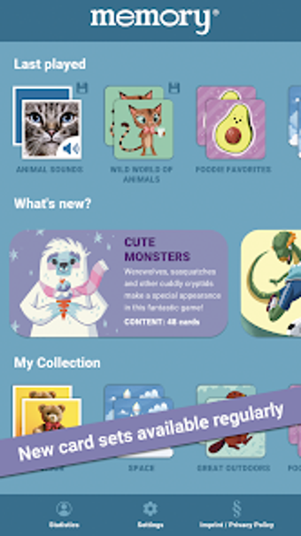 Uygulama, ünlü Bellek kart oyunu ve çeşitli setleri de dahil olmak üzere farklı kart setlerinin seçimine sahiptir. Bu setler, ses, resim ve dijital gibi çeşitli farklı varyantlarda mevcuttur. Oyunun yeni varyantı ses ve görüntü ile de uygulamada mevcuttur.